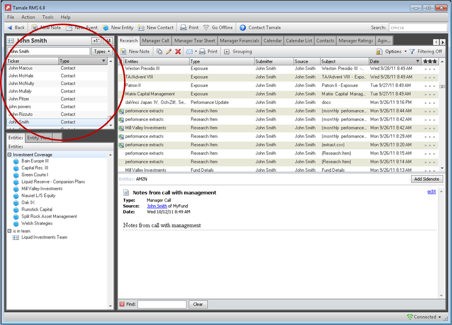 To navigate to the research deposited for a particular entity, double-click on the entity name in the Finder. All modules are linked to the Finder and will show all deposited research tagged for that entity in the Research View, the Relationships in the Research Tree, and Contacts.